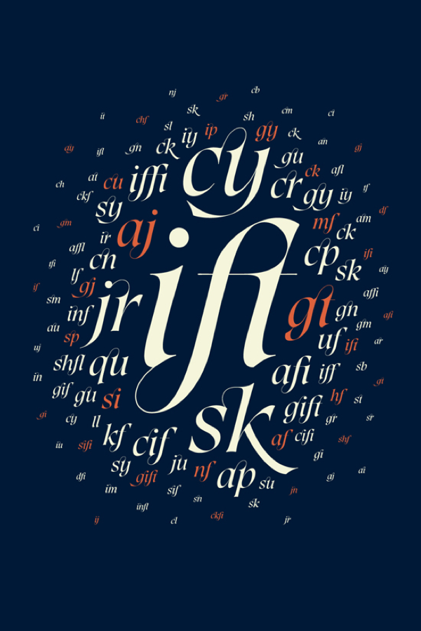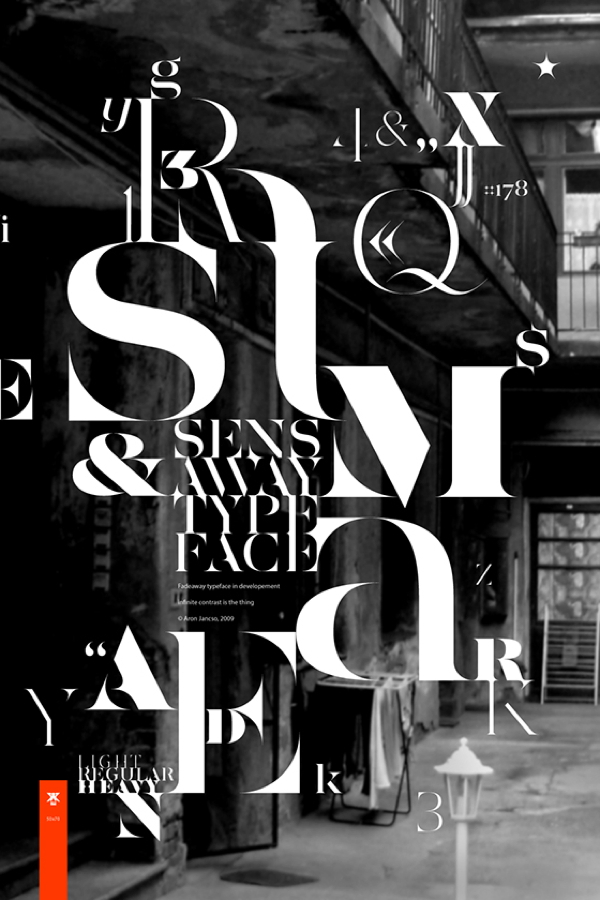 Sensaway is a family of 6 weights (light, regular, and heavy and the italics), it features over 420 glyphs and 6 OT features: standard ligatures, contextual alternated, stylistic alternates, oldstyle figures, swashes and small caps. The design features infinite contrast in stroke width, traditional serif anatomy and geometric modernist style.
