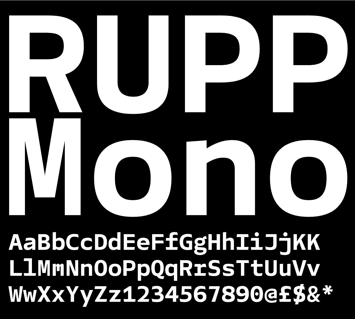 FR Rupp Mono, the unassuming and industrious typeface with quirks. Originally conceived as a custom type for our studio, Rupp Mono is an original monospaced type family designed for editorial use, longer reading, small size texts and, naturally, code editors. The typeface is built on a Grotesque/Gothic foundation but it copies no historical references.